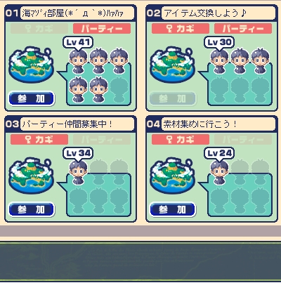 そんなこんなで、更新できないモヤモヤを打破しようと、今日は珍しく野良PT部屋にでも・・・ということで、いろいろなエリアを探索して一番おもしろそうな名前の部屋に潜入するというコンセプトのもと探し当てたのがコチラ。