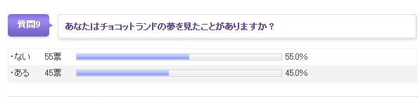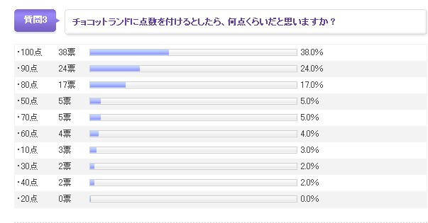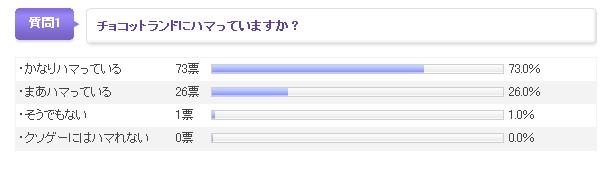 では、アンケートの結果発表いってみよ~!このアンケートはチョコットランドに関する切実な質問から、どうでもいい質問まで集めてこのブログに来てくれた方を対象に実施されたものです。皆さんのご意見誠にありがとうございました。今後のチョコットランド作りに生かしたい(どうやって?)と思います。