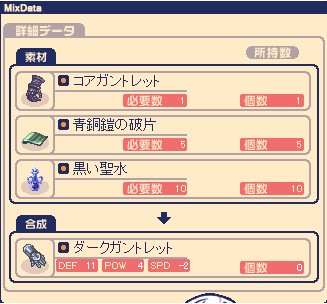 というわけで次はゴールドか、ダークか、はたまたジュエルかと悩んだ挙句「魔僧戦士」ということ(どういうことだ?)で、ダークガントレットに決定。この子が自分で黒聖水8個持っていたので、新メインから青銅瓦5枚と黒聖水2個をせしめてめでたく素材収集完了。