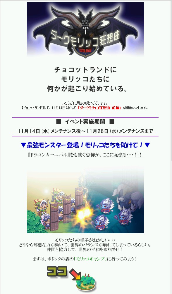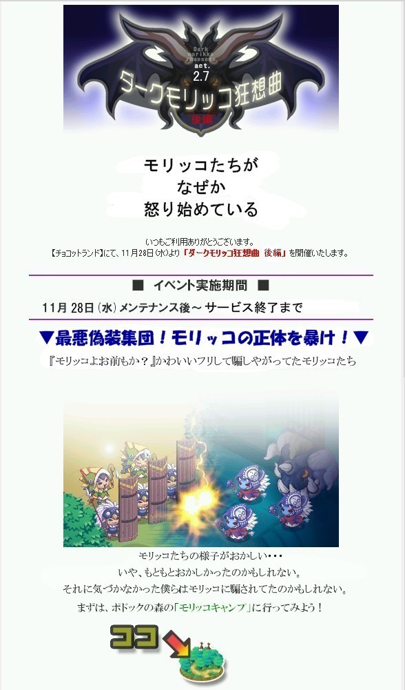 いきなり衝撃的なタイトルですが、今日のチョコットランドのメンテで「モリッコ狂想曲(前編)」なるイベントが始まりました。