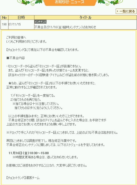 留守中のチョコットランドで臨時メンテがあったようで、不具合が修正されてますね。。ハンゲスタッフお疲れです。