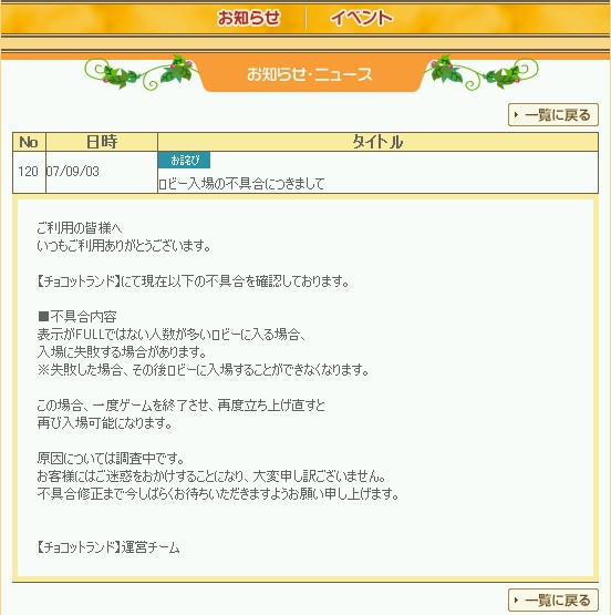 そんなこんなで、昨日のメンテ以降、チョコットランドに不具合が出ているようです。