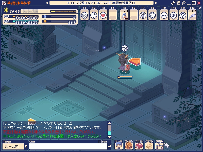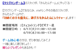 9000人近くがインしているチョコットランドに、60人しか入れないチャレンジ星。競争率66倍?(計算テキトーw)眩き結晶が今アツイアイテムなので、ココはハンゲスタッフに部屋数を増やしていただきたいところです。