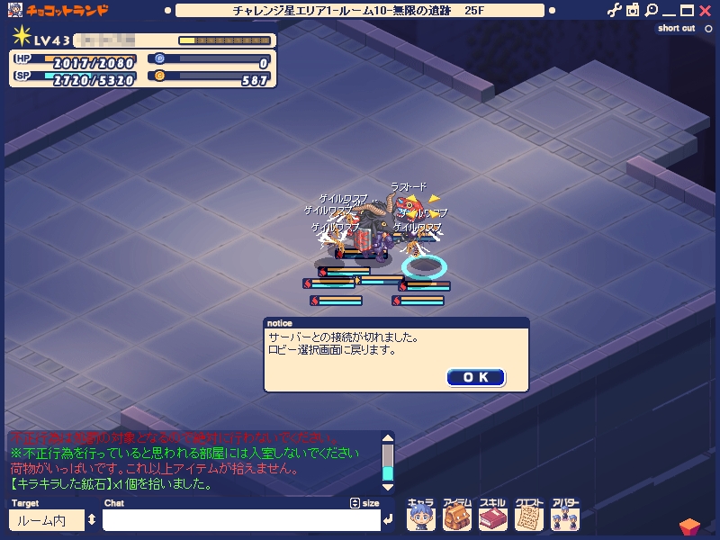 そもそもコノ遺跡、僕は長いことチョコをやっていますが、過去2回しか挑戦したことがありません。Lv30になった記念に挑戦したのと、酔った勢いに任せて挑戦してみた2回のみです。登ったことがある方ならわかると思いますが、とにかく飽きるんですよ。経験値はもちろんのこと、敵からのドロップもなし。ふと「なにやってんだろ?」って考えが頭をかすめてみたり…